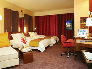 Room Description The total of 255 Deluxe World rooms comprise 135 king and 120 twin bed rooms (2 double beds). This spacious room type features 33 - 36 square meters (king) and 39 square meters (twin). All rooms have individually controlled air-conditioning, separate bathrooms, control panel, high-speed Internet access, satellite TV programme, Pay Per View movies, games, radio and in-house music, mini-bar, tea and coffee making facilities, refrigerator, safe box, smoke detector and sprinkler, IDD line telephone, and multimedia connector for video, camera, MP3, laptop, games, and iPod.
