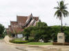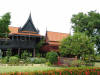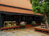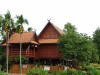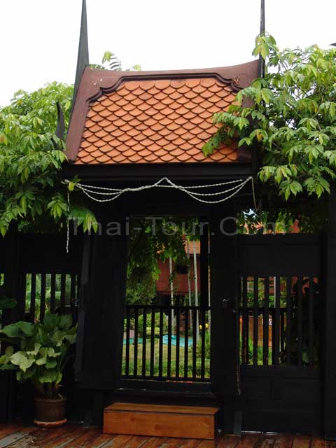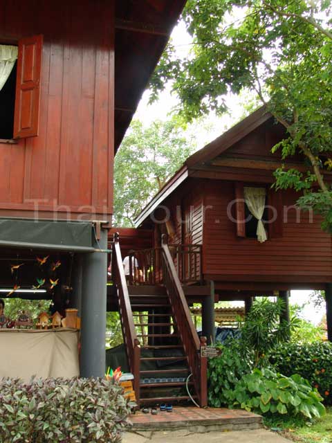 ลักษณะสถาปัตยกรรมแบบเรือนไทยโบราณ มีใต้ถุนสูง แวดล้อมด้วยไม้ดอกไม้ประดับ