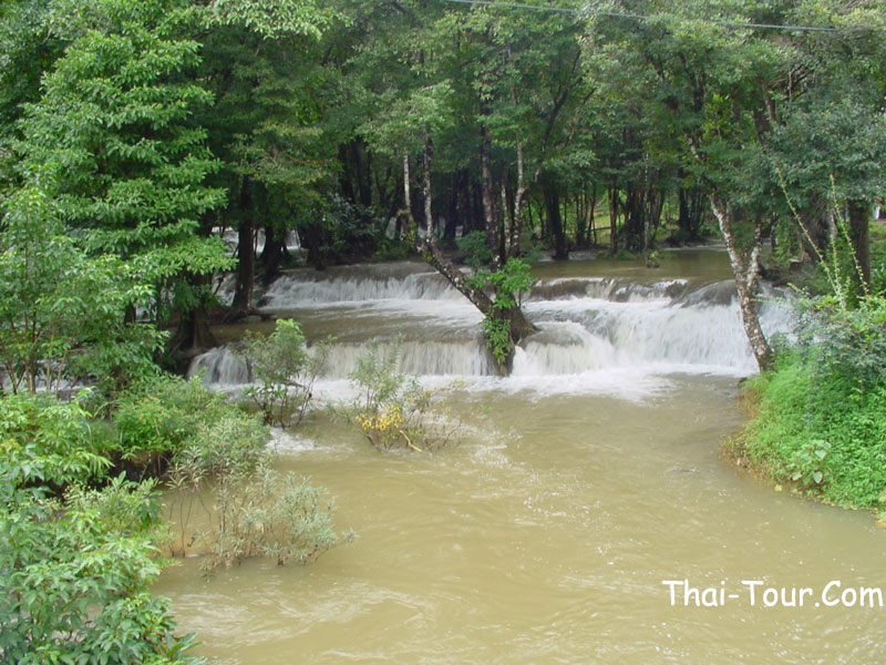 ขึ้นอยู่กับเขตอุทยานแห่งชาติเขาแหลม ตั้งอยู่ริมทางหลวงหมายเลข 323 (ทองผาภูมิ-สังขละบุรี) กิโลเมตรที่ 32–33 ใกล้กับน้ำตกไดช่องถ่อง ห่างจากอำเภอกาญจนบุรีประมาณ 173 กิโลเมตร เป็นน้ำตกขนาดเล็ก จะมองเห็นสายน้ำแผ่กระจายไหลมาจากหลายทิศทาง เหมาะสำหรับเป็นจุดพักผ่อนระหว่างการเดินทางไปอำเภอสังขละบุรี สามารถนั่งรถโดยสารสายกาญจนบุรี-สังขละบุรี จากตัวเมืองมาได้ ค่าโดยสาร 90 บาท ใช้เวลาประมาณ 3 ชั่วโมง