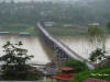 แพลากลอยอยู่กลางน้ำ ด้านหลังเป็นสะพานไม้มอญ อากาศกำลังเย็นสบาย |