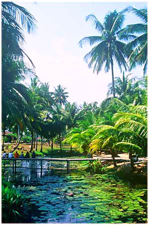 green coconut trees ..... white sand.... blue sky and crystal clear