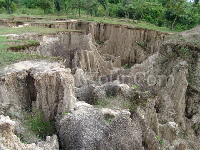 อยู่ในที่ดินของเอกชน ในเนื้อที่ประมาณ 8-10 ไร่ ลักษณะคล้าย แพะเมืองผี จ.แพร่ ละลุ ที่จ.สระแก้ว กองแลนที่จ.แม่ฮ่องสอน เกิดจากการยุบตัวของดิน ทำให้เกิดเป็นลักษณะต่างๆ กัน ดูจากในภาพด้านล่างนะครับ