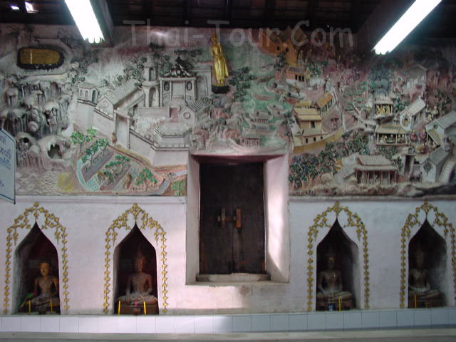 ผนังวิหารด้านบนเป็นภาพจิตรกรรมฝาผนังลักษณะแตกต่างจากทั่วไป