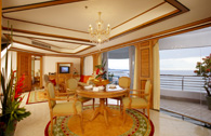 The Royal Suite, decorated with elegant and exquisite furnishings, comprises a lounge with a dining area, a large Master bedroom with a King-size bed, a walk-in closet, an anteroom and luxuriously large marble bathrooms with separate walk-in showers. The second bedroom is a Grand room with Hollywood twin beds, private bathroom and balcony sun loungers and its own separate entrance. The Royal Suite has a large terrace adorned with colorful tropical plants and is the ideal setting for an exotic cocktail party against a spectacular view of the bay and islands as a backdrop.
