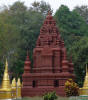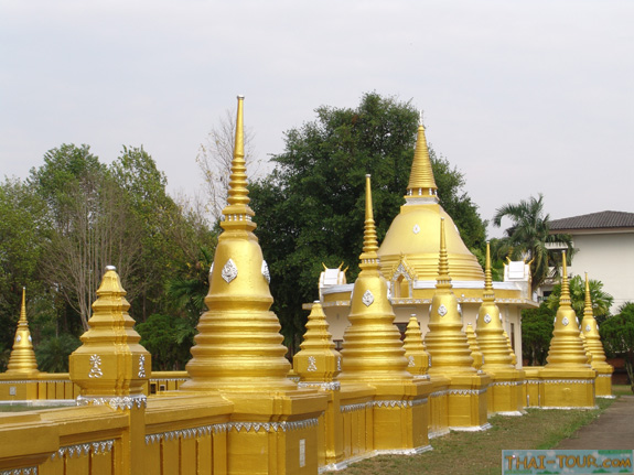เจดีย์จำลอง ตรงมุมกำแพงแก้วรอบพระอุโบสถทั้งสี่มุมได้จำลองปูชนียสถานที่สำคัญ ๆ เอาไว้ ได้แก่ พระมหาสถูปพุทธคยา พระปฐมเจดีย์ พระธาตุพนม และพระบรมธาตุไชยา สำหรับพระมหาสถูปพุทธคยานั้นสร้างได้เหมือนจริงมากเพราะได้รับความร่วมมือ จากสถานฑูตอินเดียในประเทศไทย