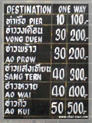 บาทต่อเที่ยวตลอด 24 ชั่วโมงขึ่นอยู่กับจำนวนคนและขนาดของเรือ