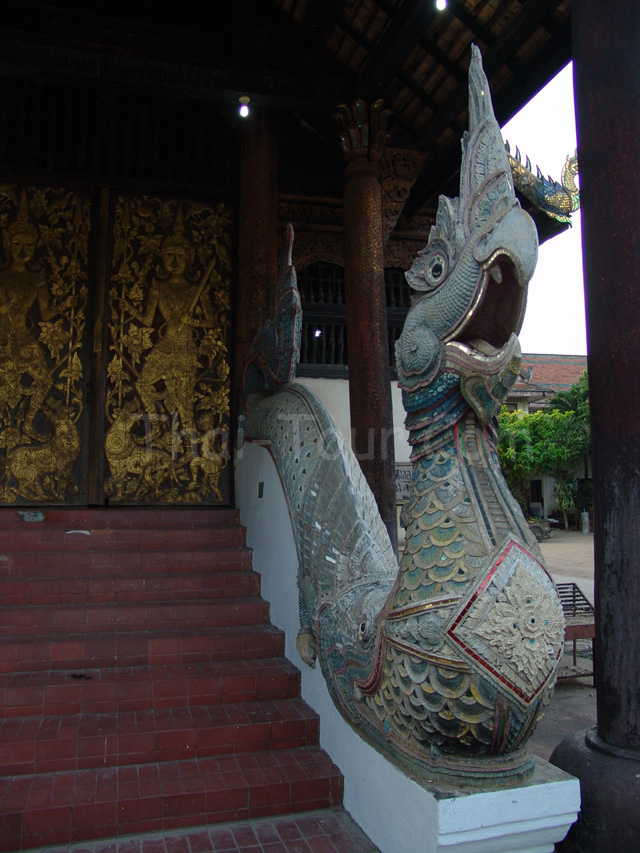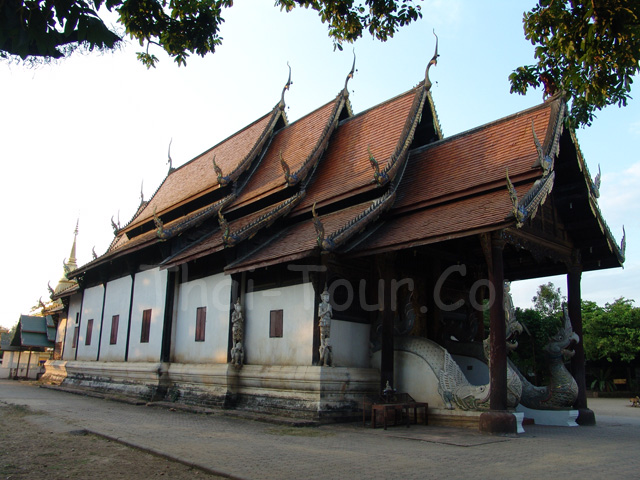หลังคาวิหารเป็นหลังคาซ้อนกัน 3 ชั้น ประดับด้วยกระเบื้องดินเผา มีช่อฟ้าและหางหงส์ เป็นรูปนาคตามคติชาวล้านนาที่เชื่อว่า วิหารเปรียบเสมือนเขาพระสุเมรุ ต้องมีนาคคอยดูแลอยู่ จึงมีการประดับตกแต่งวารด้วยนาค ส่วนลานทรายที่อยู่รายรอบวิหารหรือศาสนสถานอื่น ๆ ของล้านนาเปรียบเสมือนว่าเป็นน้ำหรือนทีสมุทร ดังนั้นจะเห็นว่า ทางเข้าด้านหน้าวิหารทำเป็นราวบันไดรูปมกรคายนาคด้วยและนาคที่นี่ก็มีลักษณะพิเศษเฉพาะตัวคือ เป็นนาคปากนกแก้วซึ่งมีเพียงแห่งเดียว ส่วนมุขโถงด้านหน้าวิหารเป็นการสร้างขึ้นมาใหม่ในสมัยที่มีการบูรณะ