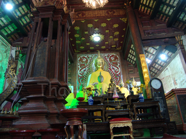 จากแผนผังวิหารแห่งนี้จะเห็นได้ว่าเป็นรูปสี่เหลี่ยมผืนผ้า ด้านหน้าและด้านหลังมีการลดขนาดความกว้างของห้องเป็น 3 ช่วง เพื่อให้สอดคล้องกับชั้นลดของหลังคา ด้านหลังทำเป็นฐานชุกชีไว้ประดิษฐานพระประธาน และพระพุทธรูป ด้านข้างเป็นที่ตั้งธรรมาสน์คาดว่าจะสร้างขึ้นพร้อมกับการสร้างวิหาร ธรรมาสน์มีลักษณะเฉพาะตามแบบล้านนา เป็นรูปทรงปราสาท ประดับตกแต่งด้วยลายพันธุ์พฤกษา และยังมีสิ่งที่ถือว่าเป็นองค์ประกอบสำคัญอย่างหนึ่งที่จะพบได้ในวิหารล้านนาทั่วไปคือ สัตตภัณฑ์ อันเป็นเครื่องสักการบูชาภูเขาทั้ง 14 ในไตรภูมิตามความเชื่อของชาวล้านนา จะใช้กันในวันพระหรือวันสำคัญทางศาสนาโดยชาวบ้านจะนำเทียนมาจุดบนสัตตภัณฑ์นี้ มีลักษณะสามเหลี่ยมหน้าจั่ว ตรงกลางทำเป็นรูปเทพพนมและมีลายพันธุ์พฤกษา ด้านหลังรูปเทพพนมประดับแก้วอังวะ (กระจกจีน) ด้านข้างทำเป็นรูปมกรคายนาค สัตตภัณฑ์นี้จะตั้งอยู่ด้านหน้าพระประธานอีกทีหนึ่ง