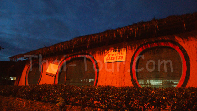 และนั่งชิมบนเก้าอี้หน้าโรงเตี้ยม ที่ทำจากดินเหนียวผสมฟาง
