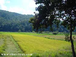 ทุ่งนาเชิงเขา ตามเส้นทางสู่ถ้ำลอด ทุ่งนาเหลืองอร่าม พร้อมเก็บเกี่ยว