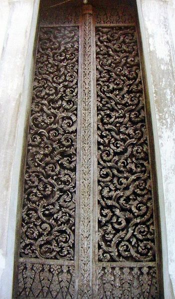 บานประตูเป็นไม้แกะสลักทั้งบาน รูปลายกนกก้านขด