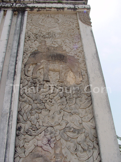 เหนือซุ้มประตูมีทับหลังเป็นปูนปั้นลายดอกบัวบาน รูปบุคคล และสัตว์ต่าง