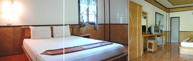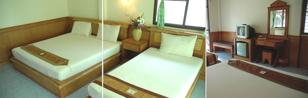 The room size is large enough which can add another extra bed comfortably. The whole room furnished with wooden furniture as wardrobe, dressing table and shelf. For truly convenience, the full facilities were added with satellite TV, mini bar, fridge and wall fan.