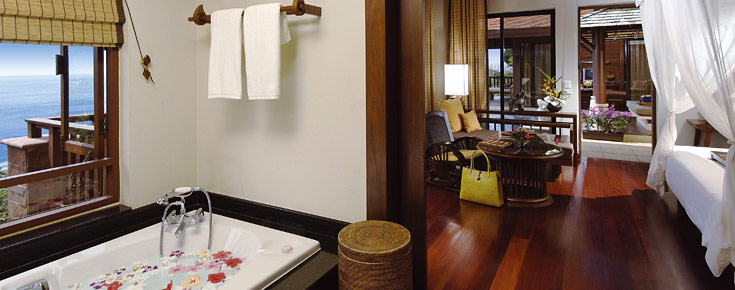 feature a polished teak wood floor, rattan curtains, rich Thai fabric