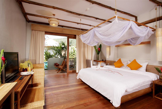 offers 76 guestrooms and villas in a tropical garden setting surrounded by a