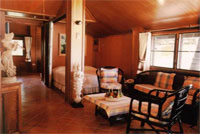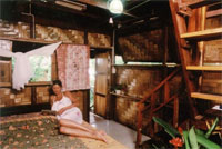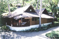 These were originally two adjoining bungalows which have been converted to a thatched "suite" with air-conditioning, (they are also screened and have ceiling fans -- the choice is yours). The two bungalows, now joined together into one have a main bedroom with ensuite bathroom, a lounge with another bathroom leading off from it and capability to sleep an extra couple.