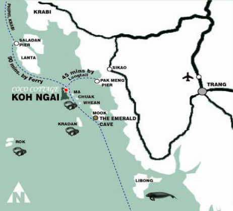• Take 40 mins from Krabi Airport, or Krabi City to Pakmeng Pier and 50 mins by Longtail boat or 20 mins by Speed boat to Koh Ngai.