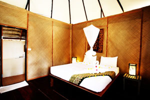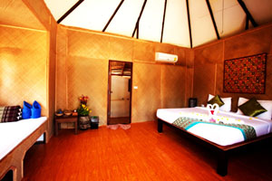 All air condition with polish wood floor, lalang roof, fabric curtain and equipped with double bed.
