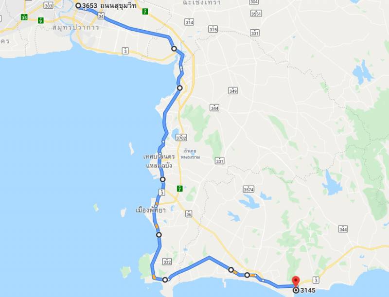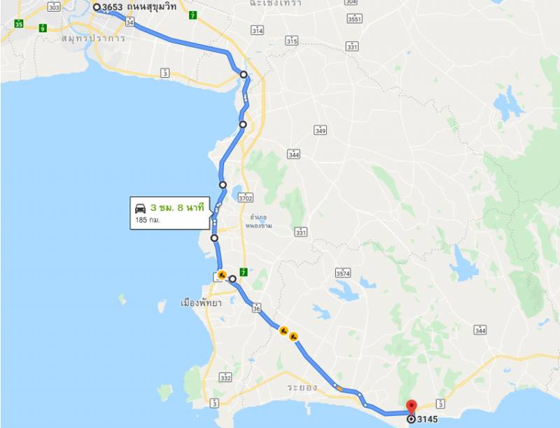เส้นทางที่ 1 ขับรถไปทางหลวงหมายเลข 3 (ถนนสุขุมวิท) จากกรุงเทพฯ ผ่านอำเภอบางปู อำเภอบางปะกง จังหวัดชลบุรี บางแสน ศรีราชา พัทยา หาดจอมเทียน สัตหีบ อำเภอบ้างฉาง ไปจนถึงอำเภอเมือง จังหวัดระยอง รวมระยะทางประมาณ 225 กิโลเมตร ตีเป็นระยะเวลาประมาณ 5 ชม. 6 นาที (อ้างอิงจาก Google Maps)