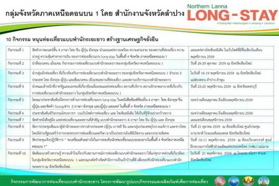 โดยได้กำหนดจัดกิจกรรม เพื่อกระตุ้นระบบเศรษฐกิจ สร้างรายได้ให้กับชุมชนในกลุ่มจังหวัดภาคเหนือตอนบน 1 (เชียงใหม่ แม่ฮ่องสอน ลำปาง และลำพูน) ให้มีศักยภาพเป็นที่ยอมรับในระดับนานาชาติ สามารถพัฒนาเป็นศูนย์กลางการท่องเที่ยว (Tourism Hub) ของภูมิภาคได้ จึงเร่งทำการตลาดเชิงรุก ส่งเสริมกิจกรรมการท่องเที่ยวแบบพำนักระยะยาวกลุ่มจังหวัดภาคเหนือตอนบน 1