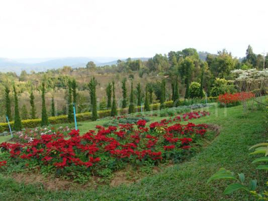 บานอวดสีสันของบรรดาไม้ดอกเหล่านี้ก็จะอยู่คงทนต่อไป จนถึงราวเดือน มีนาคม เลยทีเดียว แปลงไม้ดอกไม้ประดับที่มีเนื้อที่ถึง 3 ไร่ เริ่มต้นจากแปลงกุหลาบพันธุ์ก้านแข็ง ดอกใหญ่หลากหลายสีสัน ถือเป็นราชินีของไม้ดอกทั้งมวล แปลงเพาะพันธุ์กุหลาบจะตั้งอยู่บนเนินเขา ลดหลั่นกันลงไปเป็นชั้นๆ เห็นทิวเขาที่โอบล้อมอยู่โดยรอบ มีทางเดินที่นักท่องเที่ยว สามารถเดินลัดเลาะเที่ยวชมได้ตลอด ส่วนไม้ดอกเมืองหนาวอื่นๆ ได้แก่ แพนซี่ คาร์เนชั่น ฟอร์เก็ตมีนอท ลิ้นมังกร หน้าแมว พิทูเนีย รวมถึงคะน้าใบหยัก ที่เมื่ออุณหภูมิต่ำถึงระดับความเย็นจัด จะเปลี่ยนเป็น