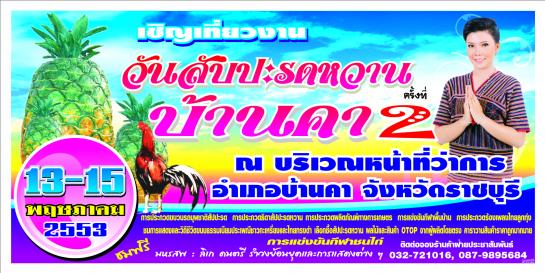 อำเภอบ้านคา..ขอเชิญเที่ยวงานวันสับปะรดหวานบ้านคา ครั้งที่ 3 ระหว่างวันที่ 12-16 พฤษภาคม 2554 ณ บริเวณหน้าที่ว่าการอำเภอบ้านคา จังหวัดราชบุรี