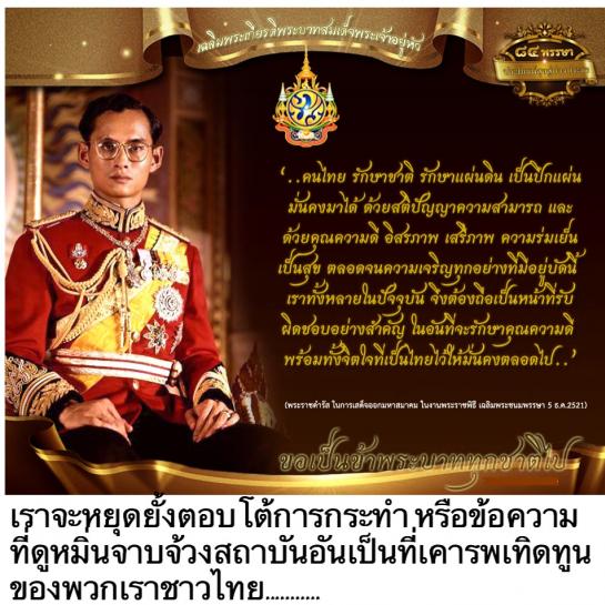 หากพวกเราชาวไทยมีสำนึกในพระมหากรุณาธิคุณ และตระหนักถึงภัยร้ายที่มีพวกฉกฉวยผลประโยชน์กำลังพยายามทำลายล้างสถาบันฯ ถึงเวลาแล้วหรือยังที่พวกเราจะลุกขึ้นเผชิญหน้ากับความเป็นจริง แสดงความจงรักภักดี ปกป้องสถาบันพระมหากษัตริย์ของเราประดุจดังต้นไม้ใหญ่ เมื่อมีไฟไหม้มาใกล้หากเราช่วยกันดับไฟ ทำนุบำรุง ดูแลรักษา ต้นไม้นั้นก็จะยังคงอยู่ แผ่กิ่งก้านสาขา ผลิดอก ออกผล ให้ความร่มเย็นเป็นสุขกับพวกเราทุกคนต่อไป...........